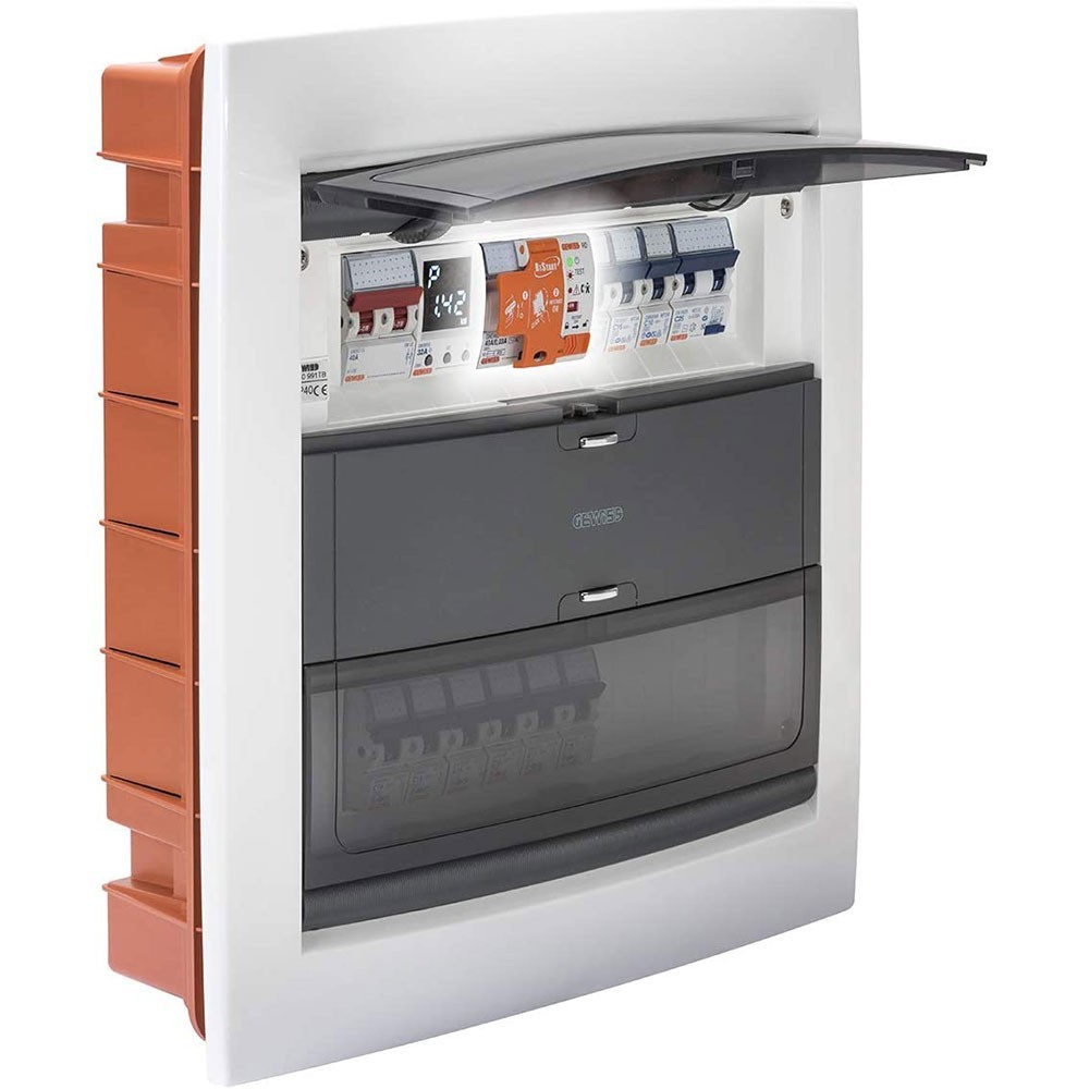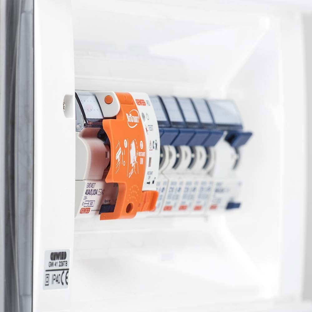 Restart RD, Gewiss, dispositivo di riarmo automatico accoppiato con interruttore differenziale puro con controllo preventivo dell’isolamento. Realizzato a 2 POLI 25 A con tipologia A Idn uguale a 0,03 A e tensione di 230 V ac.